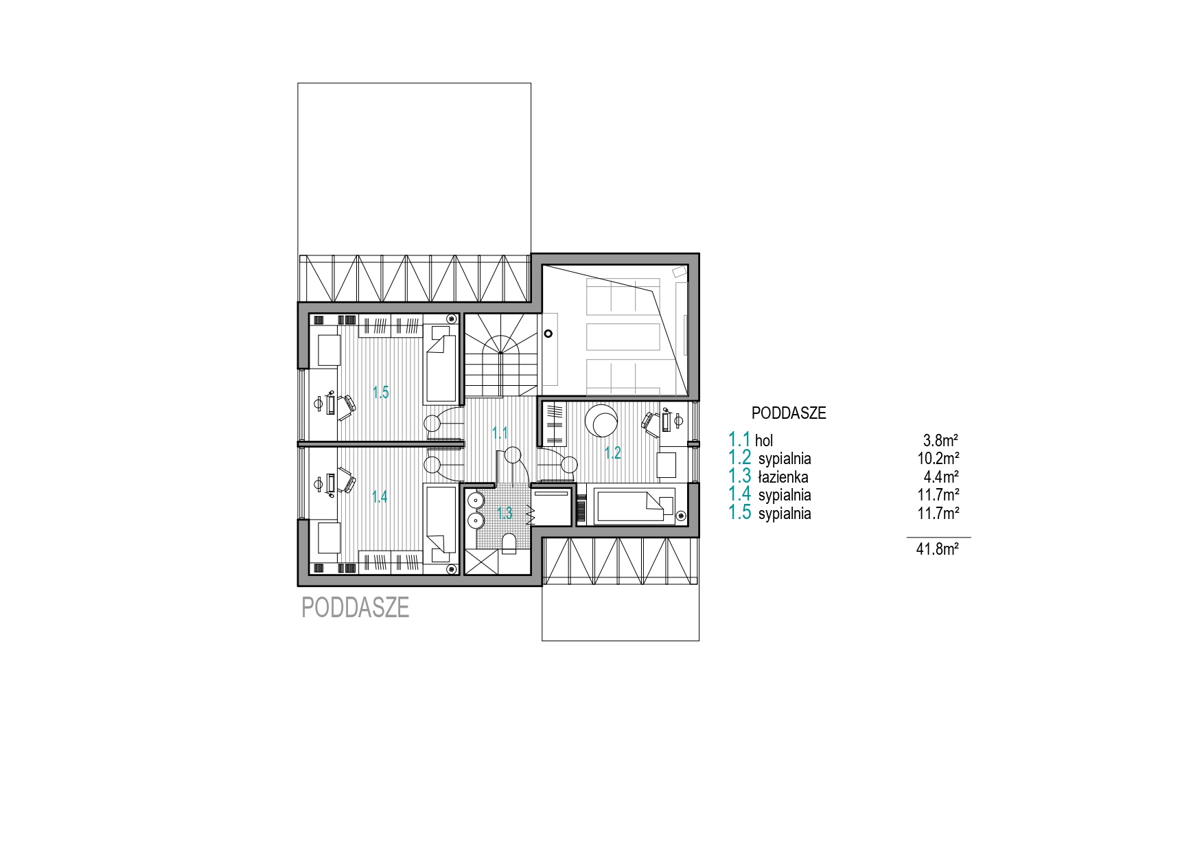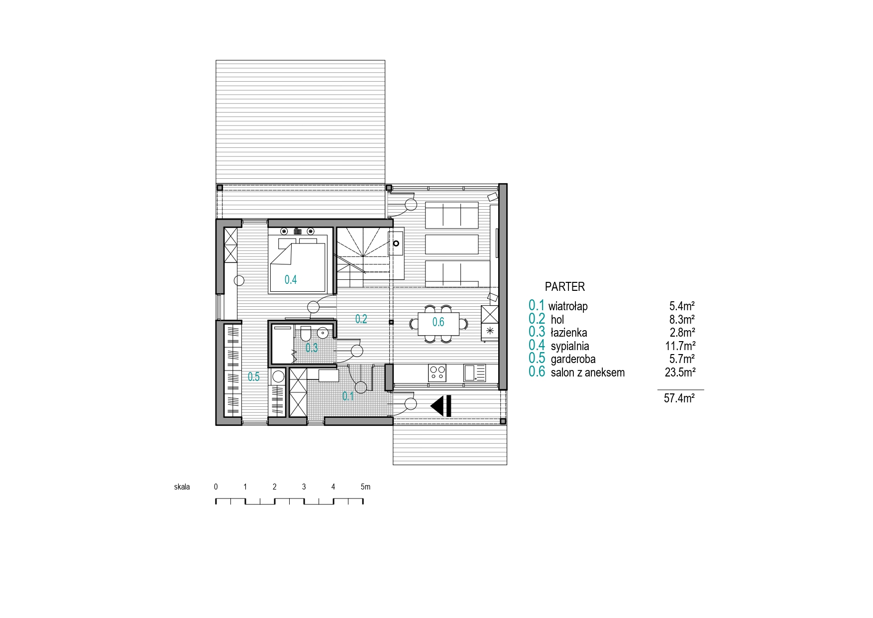 STODO to dom jednorodzinny w konstrukcji szkieletowej drewnianej. Jego powierzchnia zabudowy nie przekracza 70m2 co pozwala procedować go w trybie zgłoszenia. Kameralny, przytulny, oferujący jednocześnie dużo przestrzeni i bogaty program użytkowy; salon z aneksem kuchennym, cztery sypialnie, dwie łazienki oraz garderobę. Sypialnię nad salonem można otworzyć i przekształcić w dużą antresolę z funkcją rekreacyjną; biblioteczkę ze stolikiem kawowym, pokój kinowy czy fitnes. Zwarta forma optymalizuje zużycie materiałów budowlanych, instalacyjnych, potrzebnych do stworzenia wewnętrznej infrastruktury technicznej oraz pozwala efektywnie wykorzystać energię potrzebną do ogrzania domu.
